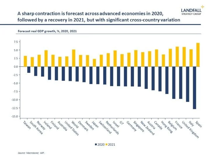 The IMF’s World Economic Outlook was released last week, with a slightly more positive assessment of global GDP growth: a contraction of 4.4% in 2020, before forecast 5.2% growth in 2021. Small advanced economies are expected to do slightly better over the forecast period; it is larger advanced economies that are hit hardest.