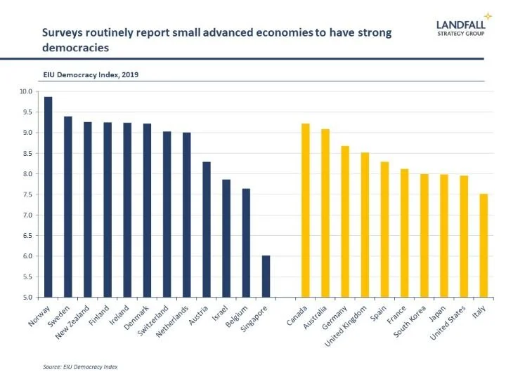 This finding is consistent with many other surveys that report strong democracies, and high levels of social capital and institutional trust, in small advanced economies.