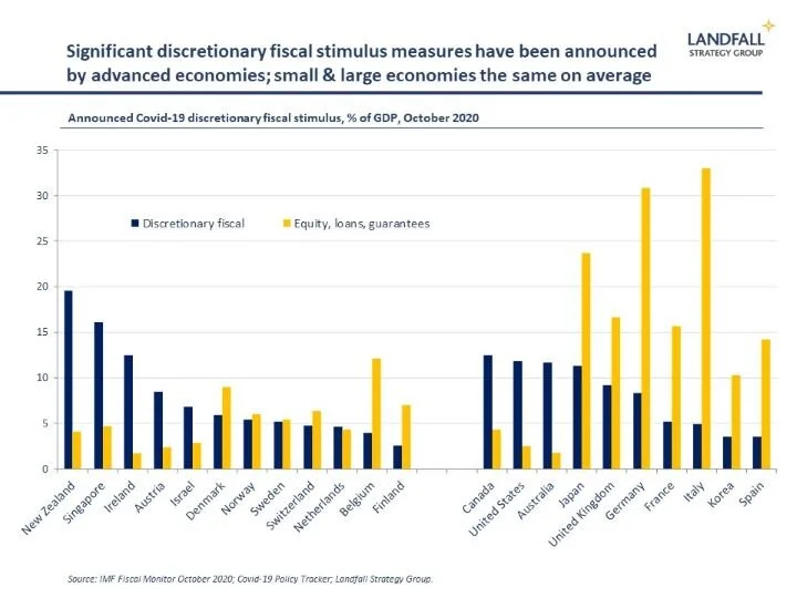 The IMF report that small economies have committed substantial amounts of discretionary fiscal stimulus in response to Covid-19, led by New Zealand and Singapore (20% and 16% of GDP respectively). This was supported by strong fiscal positions, but this experience suggests that small economies are not deeply disadvantaged in responding to economic shocks.