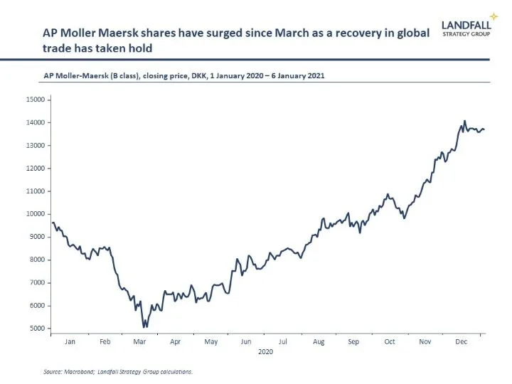 AP Moller-Maersk, the Danish shipping company, is a useful bellwether for the strength of the global economy. Its share price halved between January and March 2020, from around 10,000 DKK to just over 5,000 DKK, but then almost tripled to finish the year at around 14,000 DKK – a return of ~40% for the year, even before dividends. In addition to company intrinsics, this performance reflects the strong recovery in world trade and higher shipping prices (the Shanghai Containerized Freight Index is up 2.5x since March). This is a positive sign for the global economic outlook.