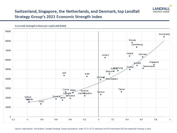 Switzerland, Singapore, the Netherlands, and Denmark top the 2021 edition of Landfall Strategy Group’s Economic Strength Index. I construct the Economic Strength Index on the basis of the specific factors that drive economic performance across small economies. Performance on skills & innovation, internationalisation, and institutional strength are particularly important. There is a tight relationship between the Economic Strength Index and variation in per capita income.