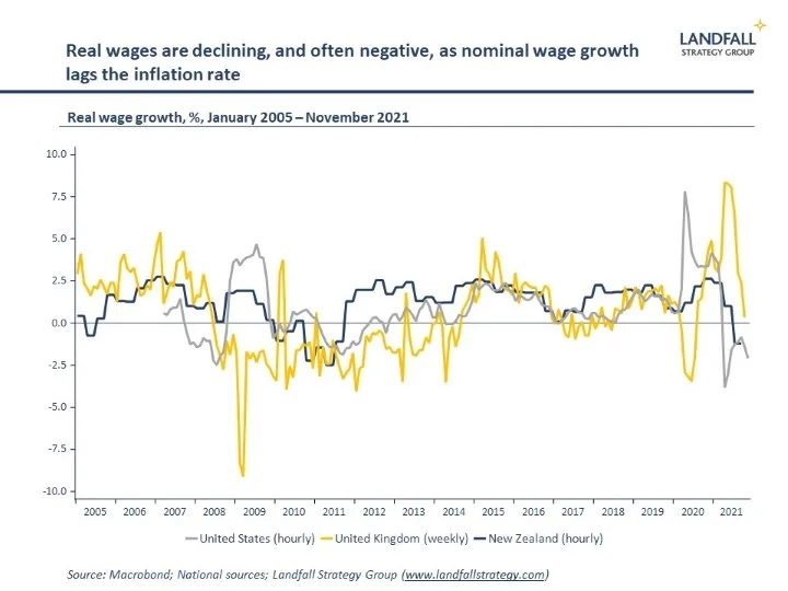 First, the rapid rise in inflation has led to negative real wage growth in many advanced economies as wage growth has been out-paced by inflation. Although labour markets seem tight (low unemployment, high quits rates, high reported labour shortages), this has not translated into real wage growth. Real wage growth is lagging labour productivity growth in many advanced economies.