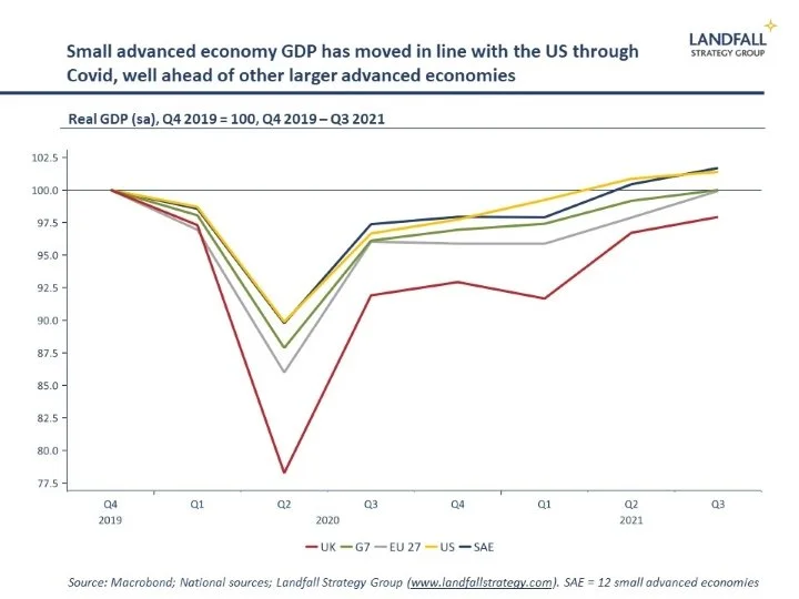 GDP growth in small advanced economies continues to out-perform most larger advanced economies (excluding the US) through Covid. This is a function of generally strong Covid management, the ability to inject fiscal stimulus into their economies, as well as their exposure to strong world trade growth through the Covid period. As was also the case during the global financial crisis, small advanced economies have turned in a resilient economic performance.