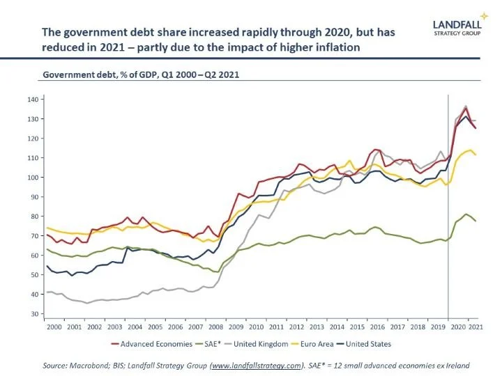 So although large fiscal deficits have been run during Covid, the impact on government debt has been controlled by strong nominal GDP growth (to which inflation has been a major contributor). Indeed, government debt/GDP (as well as private sector debt/GDP) has been reducing through 2021 despite ongoing fiscal deficits.