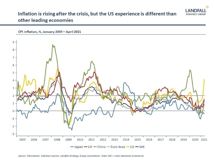 The inflation debate is also largely motivated by the US experience, where inflation was 4.2% for the year to March (April data, expected to be strong again, is out later today). But inflation is less pronounced elsewhere: CPI inflation is 0.9% in China, 1.6% in the eurozone, and across the small advanced economies – deeply exposed to global dynamics – it is 1.2%. Core CPI inflation rates are more modest again.