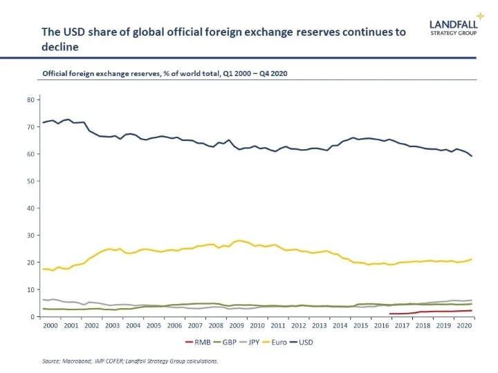 IMF data just out shows that the USD fell to a 59% share of official foreign exchange reserves worldwide, down from a 71% share in 2000. The euro has a 21% share, with small allocations to other currencies. Although there have been many predictions of the demise of the US as reserve currency, with another round of commentary after this data release, this seems a way off (short of some major political or economic shock). In the meantime, reserve currency status confers benefits on the US – although it’s not the exorbitant privilege sometimes claimed (as I wrote in this McKinsey Global Institute report a decade ago).