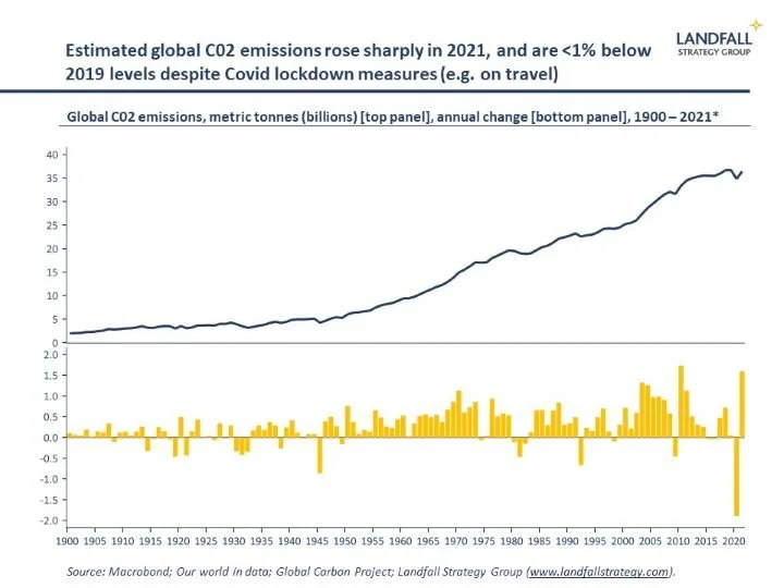 Global CO2 emissions rebounded sharply in 2021 as the global economy recovered, although they remain just below their 2019 peak. Substantial work needs to be done to drive emissions down to a pathway consistent with net zero. And the clock is ticking: 2021 was estimated to be either the fifth or sixth hottest year on record (estimates vary), with the last seven years the hottest ever documented. 2021 was 1.1 degrees above pre-industrial levels, not far away from the 1.5 degree threshold.