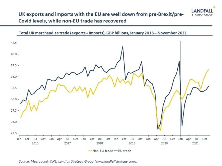 These political frictions will increasingly constrain the ability of firms to operate across global markets, increasing costs and reducing efficiency. Consider, for example, the impact of Brexit frictions: total UK trade with the EU is well below pre-Brexit levels, whereas non-EU trade has recovered more strongly.