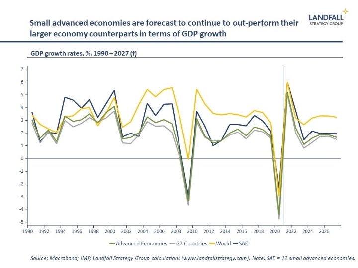 Some investors respond to rising geopolitical risk by prioritising economies with large domestic markets that are less directly exposed to global shocks. But this recent and forecast performance suggests that small advanced economies may continue to be a place to allocate capital. Strong policies and institutions, and responsiveness to external changes, will likely support small economies in navigating global regime change.