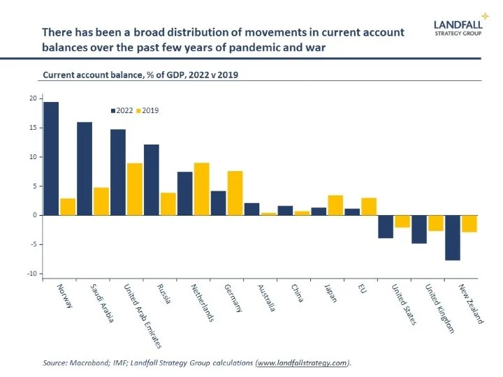 The current account balance is another useful measure of the global reordering. After a decade of compression of current account balances around the world, the pressures of pandemic and war have led to larger current account deficits and surpluses.