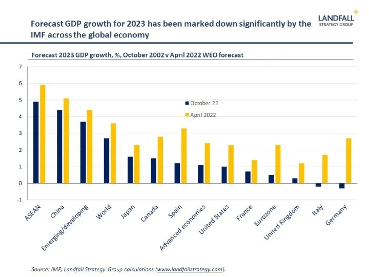 GDP growth rates were marked down significantly from the IMF’s last full set of forecasts in April, and also from the interim forecasts in July. The US was marked down by 1.3% since April, the eurozone by 1.8%, and China by 0.7%. World GDP growth for 2023 was downgraded from 3.6% to 2.7%.