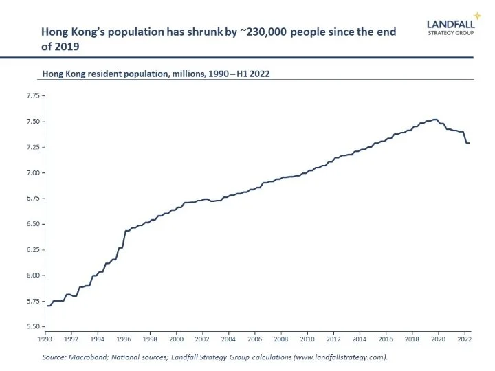 Singapore is benefiting from outflows of firms and people from Hong Kong, motivated by ongoing Covid restrictions as well as the increasingly intrusive policies of Beijing. The de facto ending of the ‘one country, two systems’ approach has made Hong Kong less attractive to many; Hong Kong’s population has shrunk by ~230,000 people since the end of 2019. And this seems likely to continue despite the government’s recently announced initiatives to attract people to Hong Kong.