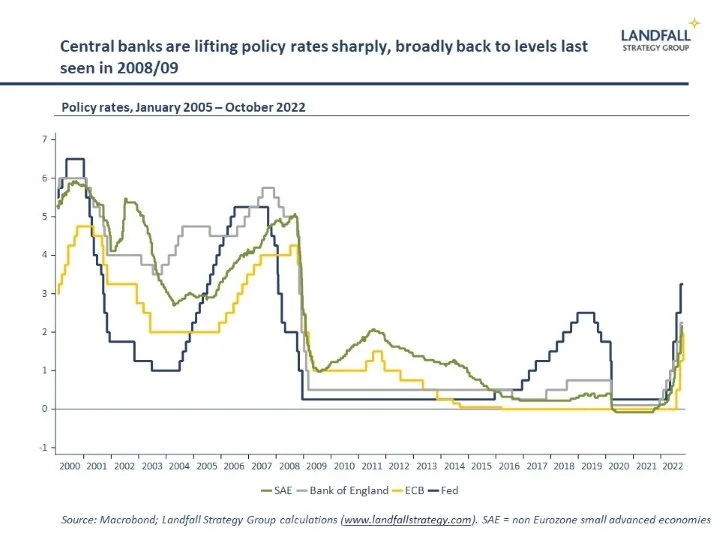 The ECB announced a 75bp increase in the policy rate yesterday, for a total of 200bp of increases since January. Across most advanced economies (ex Japan), policy rates are back to levels last seen in 2008/9 as rates were being cut to respond to the global financial crisis. Economies with relatively high core inflation (the US, the UK, Australia, New Zealand) are generally moving more aggressively. This rapid increase in rates is weighing on economic activity.