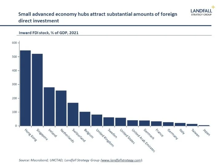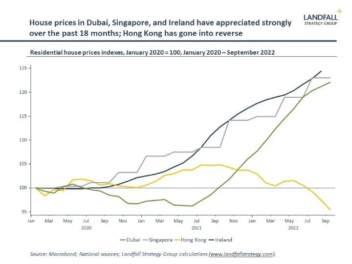 Singapore and Dubai are experiencing strong FDI and portfolio capital inflows, with firms and investors choosing to locate in these hubs. For example, Singapore attracted S$14 billion of investment in the year to Q2 2022 (~2.5% of GDP). And small economy hubs are receiving strong inflows of people, encouraged by government policy: they are deliberately competing for the mobile talent and economic activity that is on the move in response to changing global economic and political circumstances.