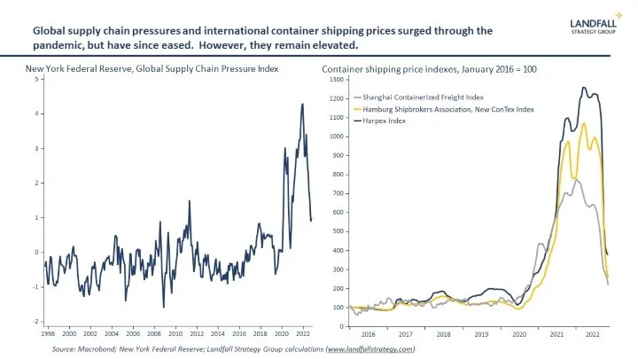 This changed demand profile is reflected in global supply chains. Significant supply chain disruptions were seen through the pandemic. Strong growth in demand for durable goods contributed to massive increases in international shipping prices and delays. But these pressures have unwound significantly, with prices, congestion, and delays down sharply.