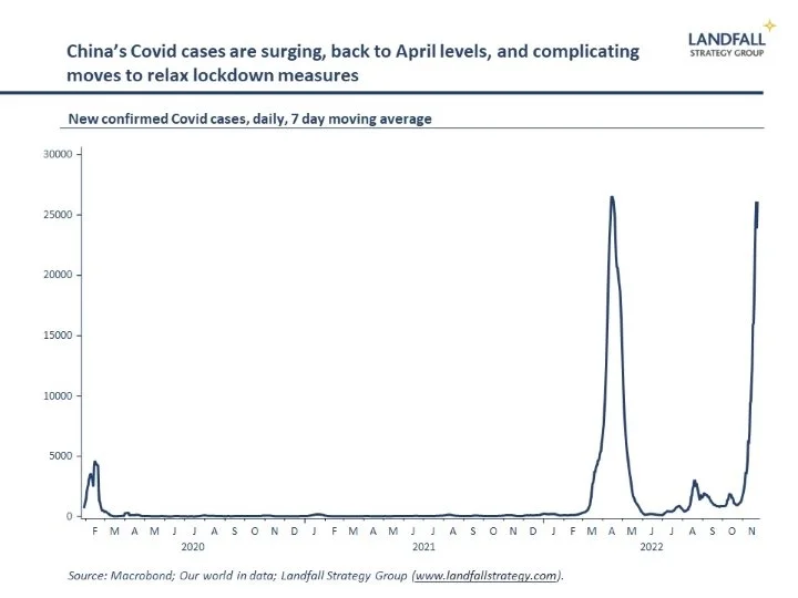 Reported Covid cases in China have been moving up sharply over the past few weeks; the 7 day moving average is now over 25,000 new cases a day. China has been pursuing rolling lockdowns in pursuit of zero Covid. And although President Xi and others have been signalling some relaxation of measures, the increase in cases complicates the trajectory. The speed with which China opens up domestically is an important factor for the global economic outlook and markets.