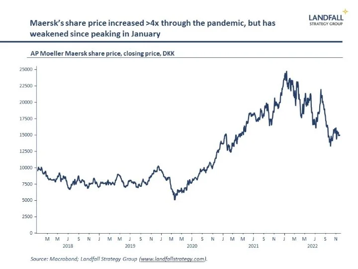 This is partly a reflection of post-Covid disruptions easing, but importantly also reducing demand as the global economy slows. Indeed, AP Moeller Maersk – the Danish shipping company – which had recorded record profits through the pandemic is forecasting a weaker outlook on contracting global container demand. Its share price is a useful barometer of the expected strength of globalisation.