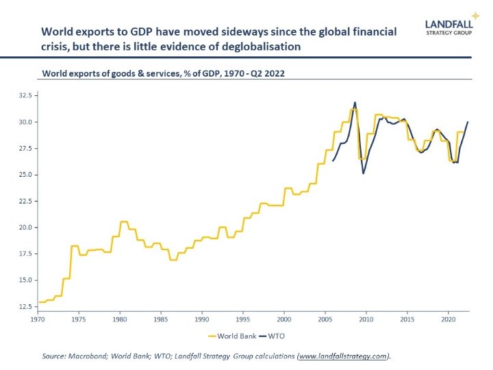 These slowing global trade flows are not evidence of deglobalisation: world exports as a share of GDP are holding up well. And the decline in forecast trade growth largely reflects weakening GDP growth. The OECD’s latest Economic Outlook, released this week, forecast weaker GDP growth across the OECD (0.8%) and the world (2.2%) in 2023.
