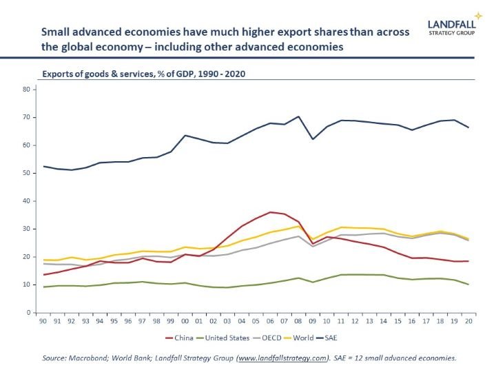 Third, the more obvious fragmentation of the global economy along political lines is leading small advanced economies to more seriously consider managing political risks in export markets and supply chains. Responding to the integration of international commerce and geopolitics is an issue across advanced economies (strategic autonomy is a preoccupation in larger economies) but the size of external sectors in small advanced economies makes this a core strategic issue.