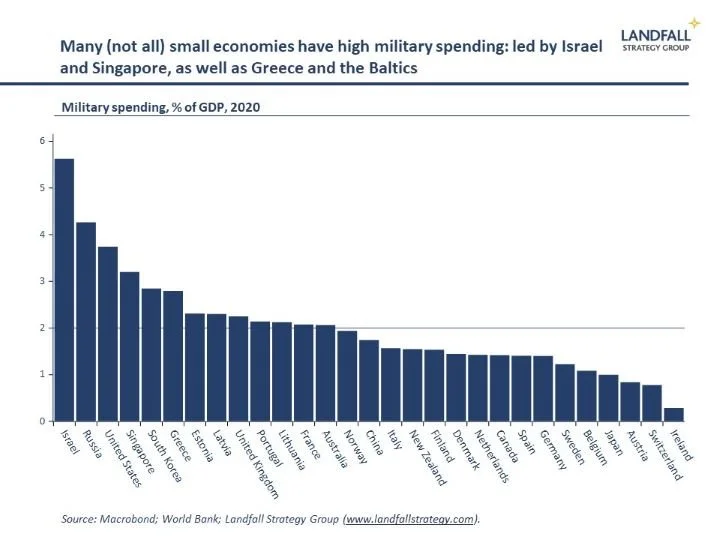 These features are one reason that many (not all) small advanced economies have high levels of military spending, notably Israel and Singapore. And several have raised military spending over the past few years, as geopolitical uncertainties have increased.