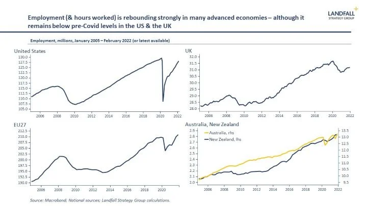 There has been a rapid recovery in employment numbers from the Covid shock. However, there is marked variation in the employment trajectory across advanced economies. In the US and the UK, employment numbers remain below their pre-Covid levels – partly on ‘the great resignation’ as people have left the workforce. However, in the EU as well as Australia and New Zealand, employment is above pre-Covid levels – partly because government support measures maintained the employment relationship between workers and firms during the pandemic.