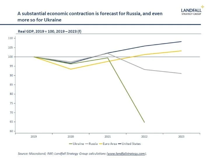 And for Ukraine, the invasion plus the involuntary decoupling from the global economy is an economic catastrophe. GDP is forecast to contract by over a third this year, with a reconstruction bill currently estimated at €200bn-500bn, >3x Ukraine’s pre-war GDP. However, post-war, Ukraine is likely to benefit from moving into Europe’s economic orbit.