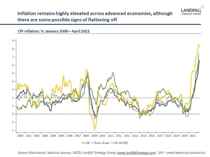 US inflation came in this week at 8.3% for the year to April, slightly down on the March reading – but higher than expected. And inflation remains high in the Eurozone (7.5%) and the UK (7.0%). Across small advanced economies, deeply exposed to the global economy, inflation is also at elevated levels (6.6%). This is importantly driven by food and energy prices. Core inflation, which strips this out, is lower: ~3% in the Eurozone, and just over 6% in the US.