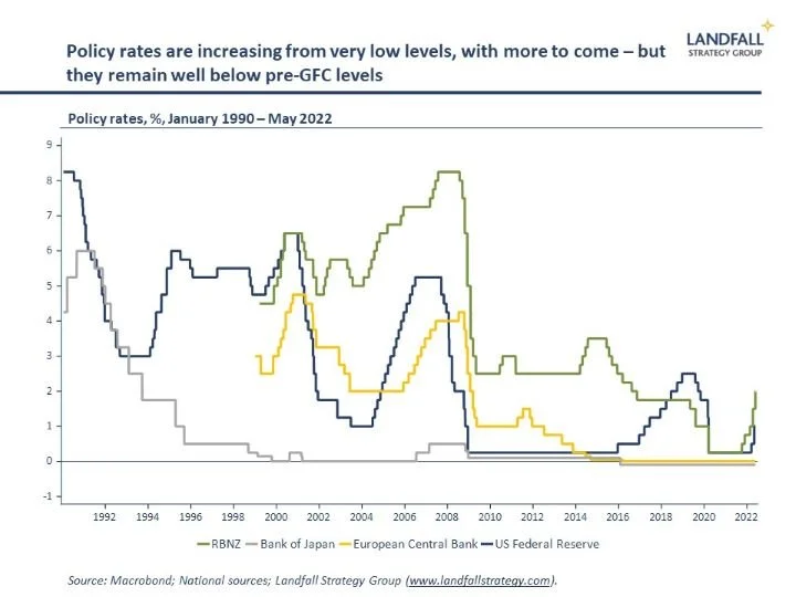 Policy rates continue to increase around the world in response to surging inflation. The Reserve Bank of New Zealand increased policy rates by 50bp during the week; and the ECB signalled rate increases to come by Q3. The issue is whether this represents a structural break from the declining profile of policy rates over the past 30 years. Central banks have encountered increasingly tight limits in raising rates over this period.