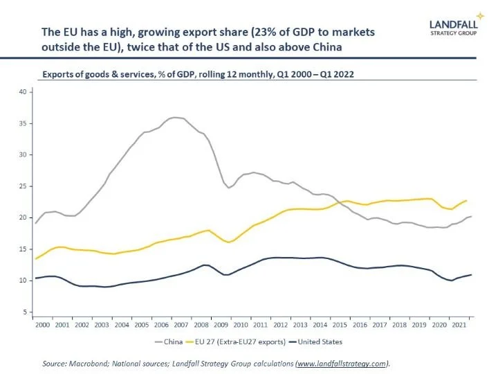 Geopolitical and domestic political are challenging aspects of global economic integration. For example, there are more examples of Western trade, investment, and technology decoupling from China. Flows to/from China have continued to increase, but restrictions are likely to strengthen over time. And China is turning inwards, reducing its exposure to the West.