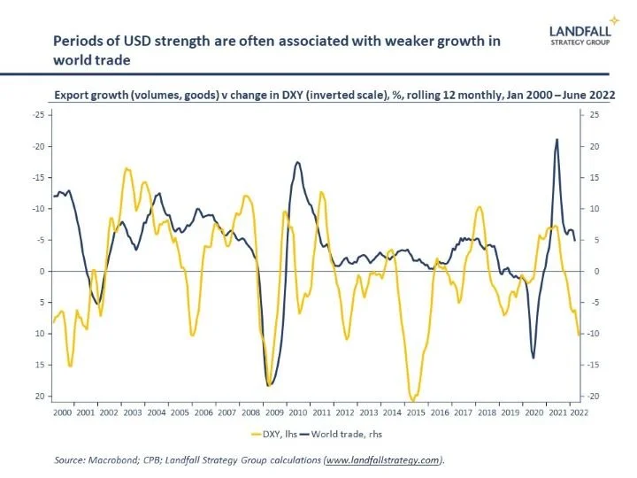A stronger USD also creates challenges for world trade growth. Because the vast majority of world trade is denominated in USD, a stronger USD increases the cost of imported goods and services – and so reduces demand. A strong USD also changes the cost and availability of trade finance. Periods of USD strength tend to be associated with weaker growth in world merchandise trade volumes.