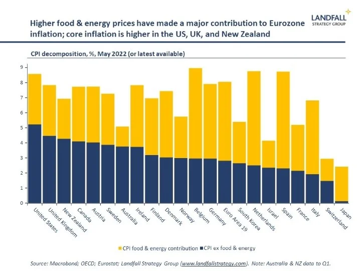 Higher energy and food prices, importantly due to Russia’s invasion of Ukraine, have contributed to the surge in inflation around the world. However, there is substantial variation. In the US and UK, inflation is due to domestic conditions to a greater extent than in the Eurozone, where higher energy and food prices are the dominant driver of higher inflation (~65% of the contribution to CPI inflation v ~40% in the US). This means that US monetary policy is likely to remain tighter than in the Eurozone.