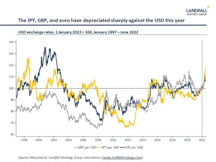 Relatively tight US monetary policy is having significant effects on exchange rates around the world. The US trade weighted exchange rate is at 20-year highs; the yen is at a 24-year low against the USD, down >30% since January 2021; and the euro and GBP have also slumped.