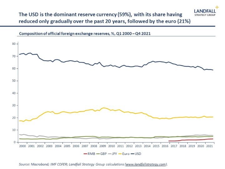 US monetary policy will remain central to the global economy, but some countries (notably China) are looking to reduce USD exposures over time – and to align exchange rate strategy with geopolitical positioning: gradually diversifying reserves, reviewing exchange rate arrangements, changing the denomination currency for some international transactions (e.g. for commodities), and developing digital currencies.
