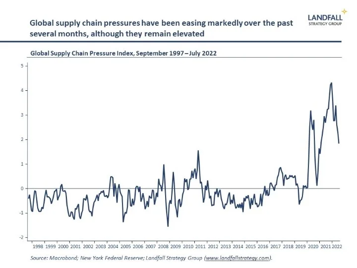Global supply chain pressures have been weakening sharply over the past several months, according to a composite measure produced by the New York Federal Reserve. International shipping congestion and delays at ports are well down, as are shipping and air freight costs. Some of the post-Covid disruptions are easing, together with a contribution from a slowing global economy. Over time, this will exert some downward pressure on inflation.