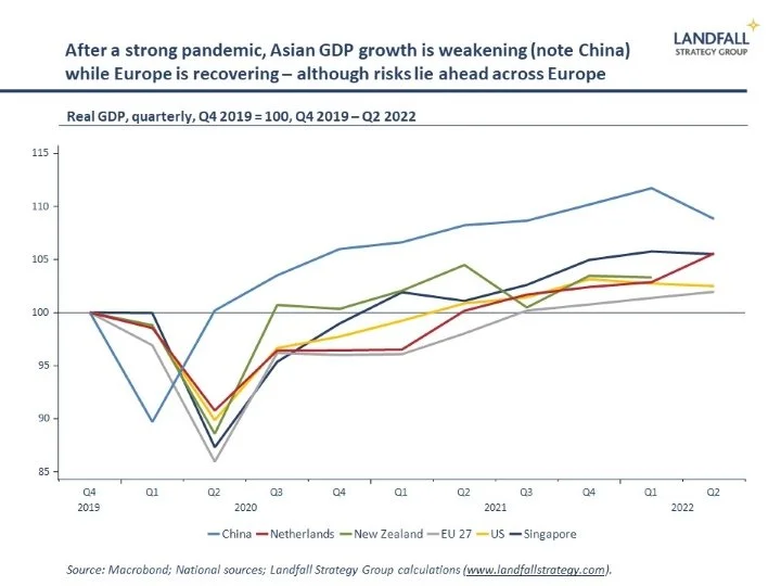Indeed, a third striking difference between Asia and Europe is the state of the economic recovery from Covid. Asian economies performed strongly through the pandemic – partly because strong initial Covid control measures allowed them to reopen relatively quickly. Many (larger) European economies did not do as well.