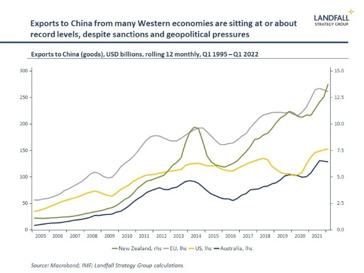 This ‘geopolitical awakening’ has reinforced already toughening policy stances on China. The US has strengthened its hawkish stance, on issues from Taiwan to reducing flows of sensitive technology and investment between the US and China. Japan and Taiwan have announced big defence spending increases. And there is a shifting stance in New Zealand, with official encouragement for firms to diversify away from China; and stronger language on Chinese behaviour in the Pacific.
