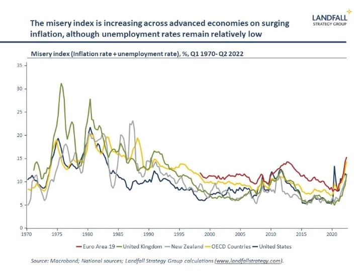 The ‘misery index’ – the sum of inflation rate and unemployment rate – has moved up sharply across advanced economies. It is now sitting at levels at or above those seen during the global financial crisis; and before that last seen in the 1980s and 1990s – although we are still a distance from the 1970s. One key difference from the 1970s is that this increase is driven mainly by surging inflation – with very tight labour markets. Indeed, this week the Eurozone reported both record high inflation (9.1%) and record low unemployment (6.6%).
