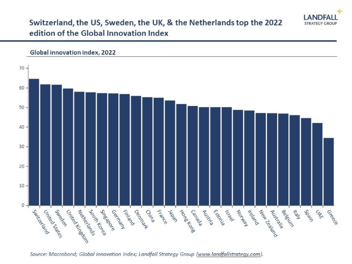 Switzerland, the US, Sweden, the UK, and the Netherlands, topped the 2022 Global Innovation Index, released this week. This is a useful measure of underlying productive potential across economies. The strong performance of many small advanced economies on this measure is instructive. Particularly for small advanced economies, innovation performance is central to developing and sustaining positions of competitive advantage in global markets.