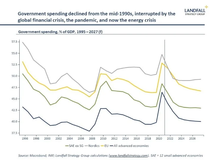 The past 30 years of the Great Moderation have supported a declining government spending track, but that is now unwinding. Global stress and disruption combined with changing public expectations are leading to upward pressure on government spending and public debt levels.